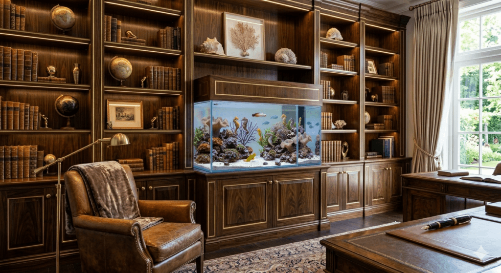 >Dica de Design: Pode-se usar um espelho nas laterais do aquário marinho para dar continuidade ao móvel, criando uma unidade visual completa entre a parede e o equipamento.